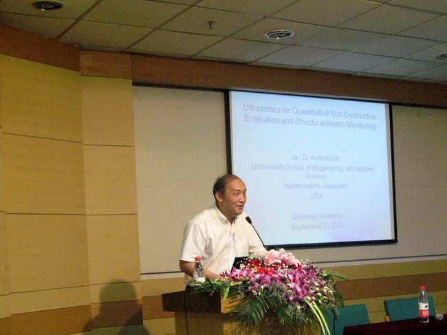 在外國知名學(xué)者項目的支持下,美國西北大學(xué)土木與機械工程系Walter P. Murphy和McCormick杰出學(xué)院教授J.D. Achenbach日前應(yīng)邀到浙江大學(xué)訪問(途徑上海)。Achenbach教授是美國工程院、科學(xué)院和藝術(shù)與科學(xué)院院士以及荷蘭皇家科學(xué)院院士,除了獲頒Timoshenko獎(人稱力學(xué)諾貝爾獎)、William Prager獎和Theodore von Karman獎等各類專業(yè)獎勵外,他還于2003和2005年分別獲得美國國家技術(shù)獎和國家科學(xué)獎這兩項美國政府頒發(fā)的最高科技獎勵,是國際上波動學(xué)和無損檢測技術(shù)等方面的頂級權(quán)威學(xué)者。