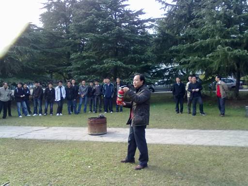 隨后,大家在教四前面的草坪上進行了應急疏散演練。演練所用的是手提式1211滅火器。首先要拔掉消防栓,另外要注意不要倒過來使用,使用時要站在上風向進行滅火。