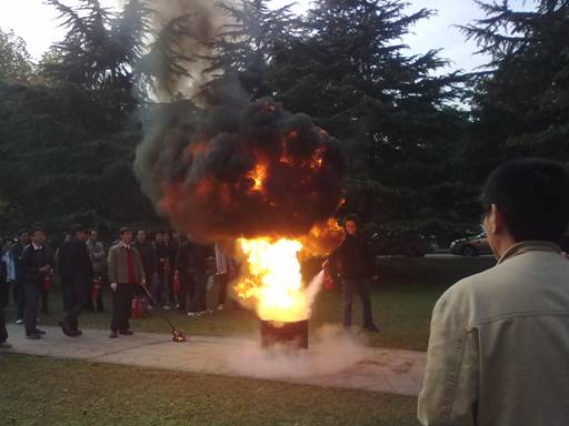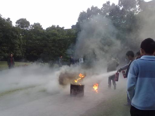 隨后,大家在教四前面的草坪上進行了應急疏散演練。演練所用的是手提式1211滅火器。首先要拔掉消防栓,另外要注意不要倒過來使用,使用時要站在上風向進行滅火。