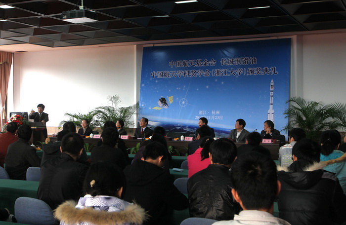 中國航天基金會·長城潤滑油中國航天學科獎學金首屆頒獎典禮于11月23日上午10:30在我校玉泉校區邵科館隆重舉行。中國航天基金會秘書長張玉江將軍、中國石化潤滑油公司黨委茍連杰副書記、中國航天基金會事業發展部部長殷建剛大校、中國石化潤滑油公司總經理辦公室皮天福副主任以及我校黨委鄭強副書記、黨委學工部金海燕部長、黨委研工部呂淼華部長、航空航天學院李平副院長出席了頒獎典禮,典禮由航空航天學院黨委謝紅梅副書記主持。