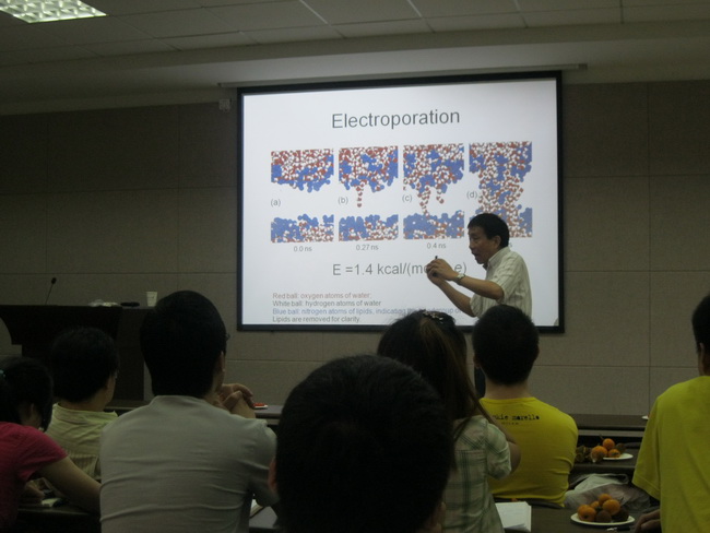 張統一教授作了題為“Molecular dynamics simulations on phospholipids in water under external electric field”的報告,磷脂是細胞膜的一個主要成份,它是一種兩親性分子且在水中能形成易溶的液晶相。由于其在生物工程以及納米科技領域的潛在應用前景,這方面的研究受到廣大科研工作者的關注。細胞膜的電穿孔和電融合現象在很大程度上由兩親性分子在電場作用下的力學行為決定。張統一教授深入淺出地報告了水中磷脂在電場作用下的分子動力學模擬的一些最新結果,結果顯示在電場作用下細胞膜的再定向、相變和水合作用的水平決定了分子的最終結構。借助分子動力學模擬這一工具可以很清楚觀察到在細胞膜的再定向及相變過程中電穿孔、電融合等現象。報告引起了參會者對分子動力學模擬方面的興趣。