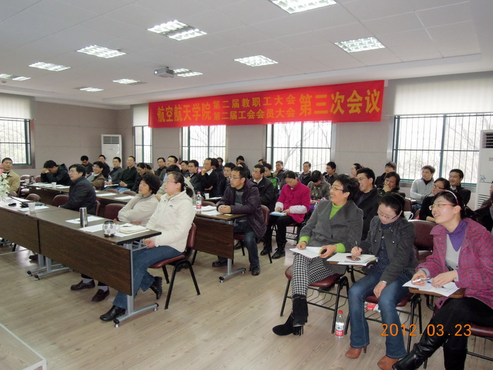 2012年3月23日上午,經過前期認真而充分的籌備,航空航天學院第二屆教職工大會、工會會員大會第三次會議在教五333會議室隆重舉行。學院教職工、工會會員共62人參加了本次大會。大會由學院黨委副書記、工會主席謝紅梅主持。