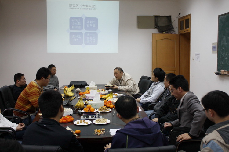 支部書記王鵬博士首先通過近期貴州畢節五名流浪兒的悲劇,配以生動的幻燈片和音樂,提出了農民工子女教育和安全等問題;李鐵風老師結合新聞圖片談了湖南老家農村空心化,村容凋敝的問題;李倩倩博士提出了對留守兒童群體的諸方面擔心;龔博、馮瓊、胡昉、金濤等博士由圍繞新聞就計劃生育、城鄉教育設施和水平差異以及農村教育重男輕女等議題發表了自己的看法;董臣令、張逸塵等博士認為應該加大社會保障特別是底層弱勢群體的保障力度;徐明、黃洋博士就民工子女的異地教育和安全管理問題給出了自己的意見;董策舟、單曄杰、劉德重等博士認為加大教育和科研投入十分必要,駁斥了社會上一度盛行的“讀書無用論”;王鵬博士補充說教育應該多元化,尤其在欠發達地區,更應該讓家庭轉變傳統觀念,加大職業教育的投入。