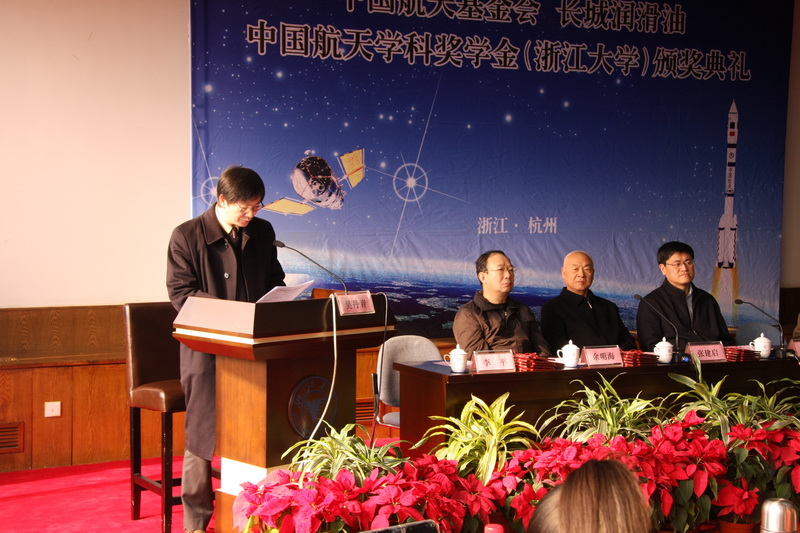 11月27日上午9:30,中國航天基金會·長城潤滑油航天學科獎學金第三屆頒獎典禮在我校玉泉校區邵科館212室隆重舉行。原中國人民解放軍總裝備部副部長、現任中國航天基金會理事長張建啟中將,原東海艦隊副政治委員余明海少將以及我校黨委任少波副書記、航空航天學院常務副院長鄭耀,副院長李平、黃志龍等出席了頒獎典禮。頒獎典禮由航空航天學院黨委書記吳丹青主持。