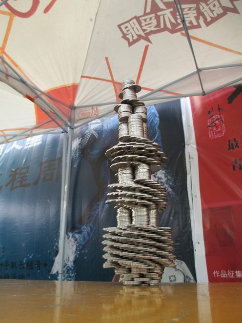 比賽的規則是在一枚硬幣上堆砌盡可能多的硬幣,其比賽難度和所需力學知識量可想而知,在場比賽的選手在堆硬幣的過程中不斷思考新的堆疊方法,使得這一枚硬幣能夠支撐更多的硬幣,當然在堆硬幣的過程中也有不少選手的作品由于操作不慎而倒塌。但是選手們能夠認真總結,再用新的結構來搭建更多的硬幣。選手們在不斷的嘗試后創造了很多優秀的作品,引來了路人的圍觀和贊嘆。其中羅冬陽同學重達7.985KG的作品贏得了比賽的第一名和大家的一致好評,路人們紛紛與其合影留念。通過這次比賽,不僅考驗和鍛煉了學生們的動手能力,還讓在場同學們能夠更好地了解航空航天學院的專業信息和特色。