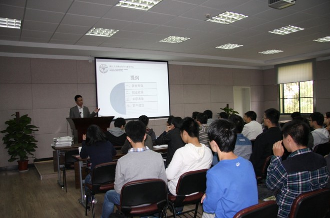 隨后,戴志潛副書記還對(duì)國家、省市等有關(guān)高校畢業(yè)生的就業(yè)政策進(jìn)行解讀。從實(shí)際層面出發(fā),他圍繞就業(yè)知識(shí)系統(tǒng)地給大家上了生動(dòng)的一課。他先從“就業(yè)敲門磚”——簡歷入手,具體給大家介紹了制作簡歷、簡歷投遞等的注意事項(xiàng);提醒畢業(yè)生們?cè)诿嬖囘^程當(dāng)中應(yīng)該注意的諸多問題;最后還介紹了關(guān)于三方協(xié)議簽訂及違約、勞動(dòng)合同法等知識(shí),使在座畢業(yè)生們受益匪淺。