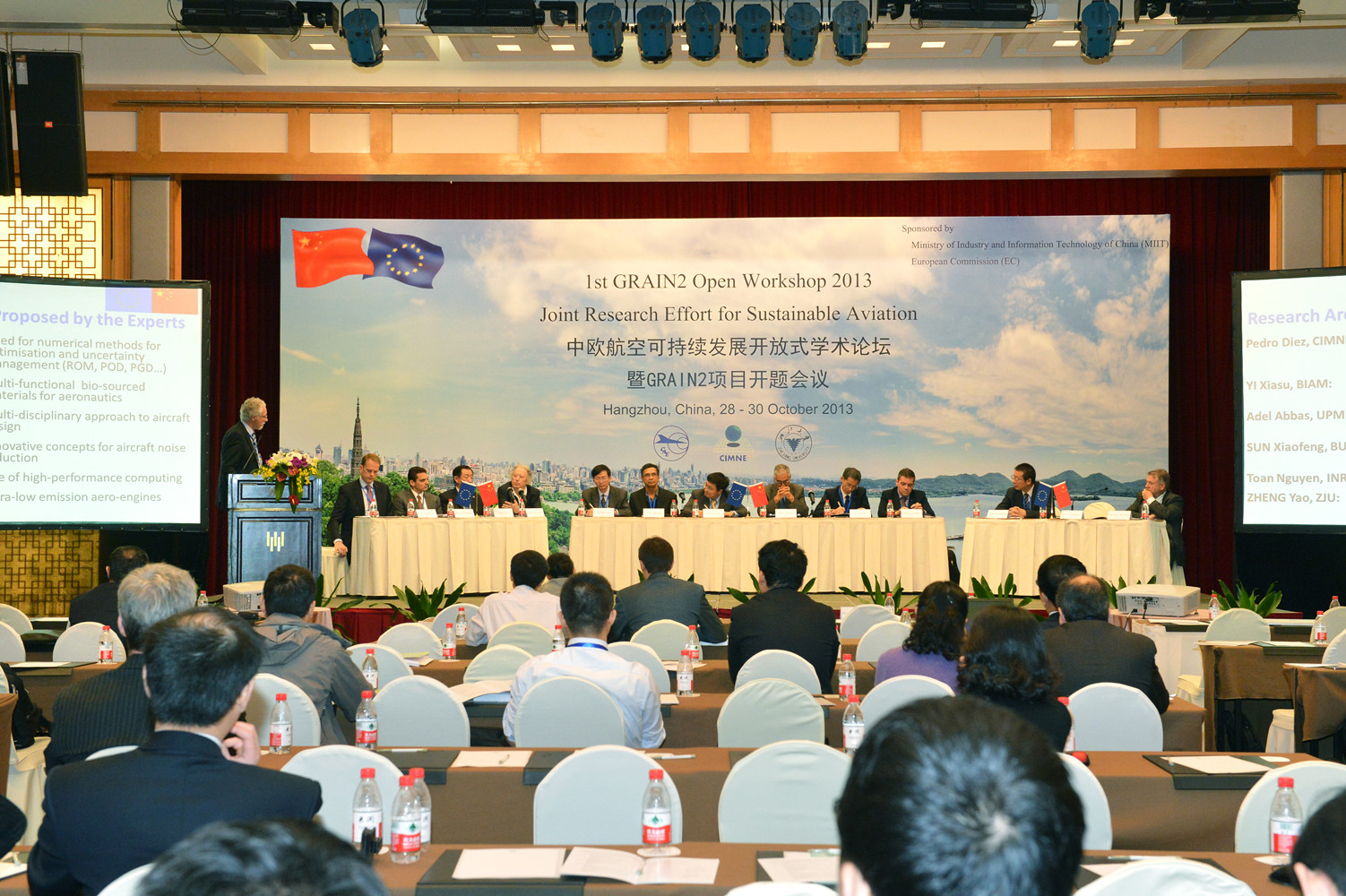 浙江大學黨委副書記嚴建華、歐盟駐華使團科技參贊Philippe Vialatte、中國工業和信息化部裝備工業司航空處調研員石靖敏、工程中數值方法國際中心(西班牙)教授Gabrel Bugeda、中國航空研究院常務副院長魏金鐘參加會議并致開幕辭。開幕式由中國航空研究院處長孫健和工程中數值方法國際中心(西班牙)教授Jacques Periaux共同主持。中國航空研究院副院長華俊、空客北京工程技術中心總經理Pedro Fernández-Rodríguez、北京大學副校長陳十一做了引言報告。