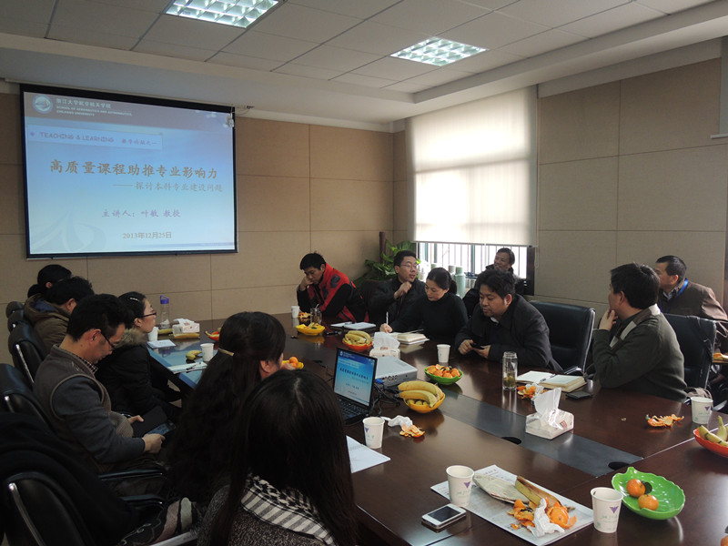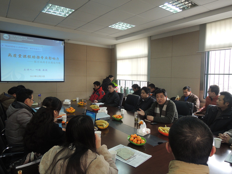 2013年12月25日中午,航空航天學(xué)院“教與學(xué)”系列教學(xué)論壇在玉泉校區(qū)第五教學(xué)樓326會議室首次舉行。論壇以主題發(fā)言和自由討論相結(jié)合的形式進(jìn)行,首次論壇邀請了工程力學(xué)系葉敏教授作題為“高質(zhì)量課程助推專業(yè)影響力——探討本科專業(yè)建設(shè)問題”的主題發(fā)言,全院30余名一線教師參加了本次交流。