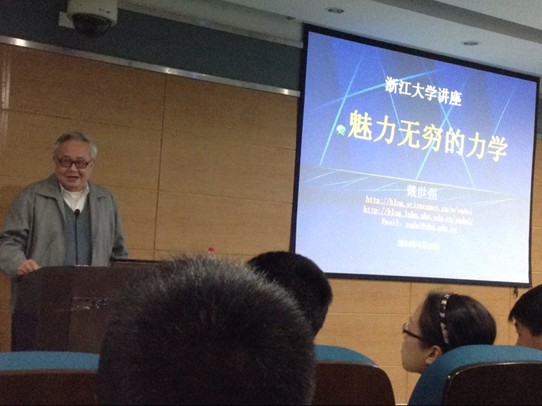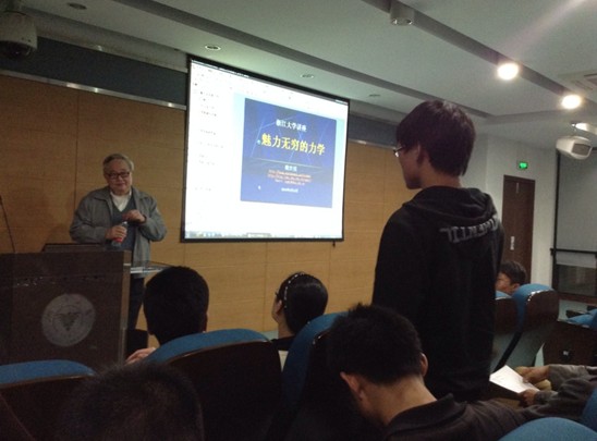 本屆開幕式非常榮幸地邀請了上海大學終身教授、博士生導師戴世強教授。戴世強教授首先向我們敘述了力學的定義、特點和發展簡史,強調力學在國民經濟和重點單位或重點任務建設中無所不在的廣泛應用;接著講述了力學的科學美,以流體力學為例,從陽剛美、陰柔美和變易美的角度闡明力學的無窮魅力,激起了同學們強烈的學習熱情。深刻的見解、睿智的話語,給學子們以無限的啟發,現場不時響起熱烈的掌聲。最后戴教授耐心地回答了同學們的提問,并拓寬了同學們的研究思路。本屆空天學術文化節開幕式在副院長邵雪明老師對戴世強教授的感謝以及對同學們的期望中結束了。