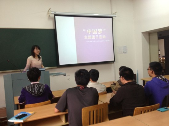 活動(dòng)的第一個(gè)環(huán)節(jié)是由團(tuán)支書(shū)向同學(xué)們簡(jiǎn)要介紹了黨的十八大、十八屆三中全會(huì)精神,并播放了習(xí)近平總書(shū)記闡述“中國(guó)夢(mèng)”的視頻,同學(xué)們認(rèn)真學(xué)習(xí)并且不時(shí)打斷提出自己的問(wèn)題,這表現(xiàn)出了同學(xué)們對(duì)于黨的發(fā)展問(wèn)題的極大熱情。