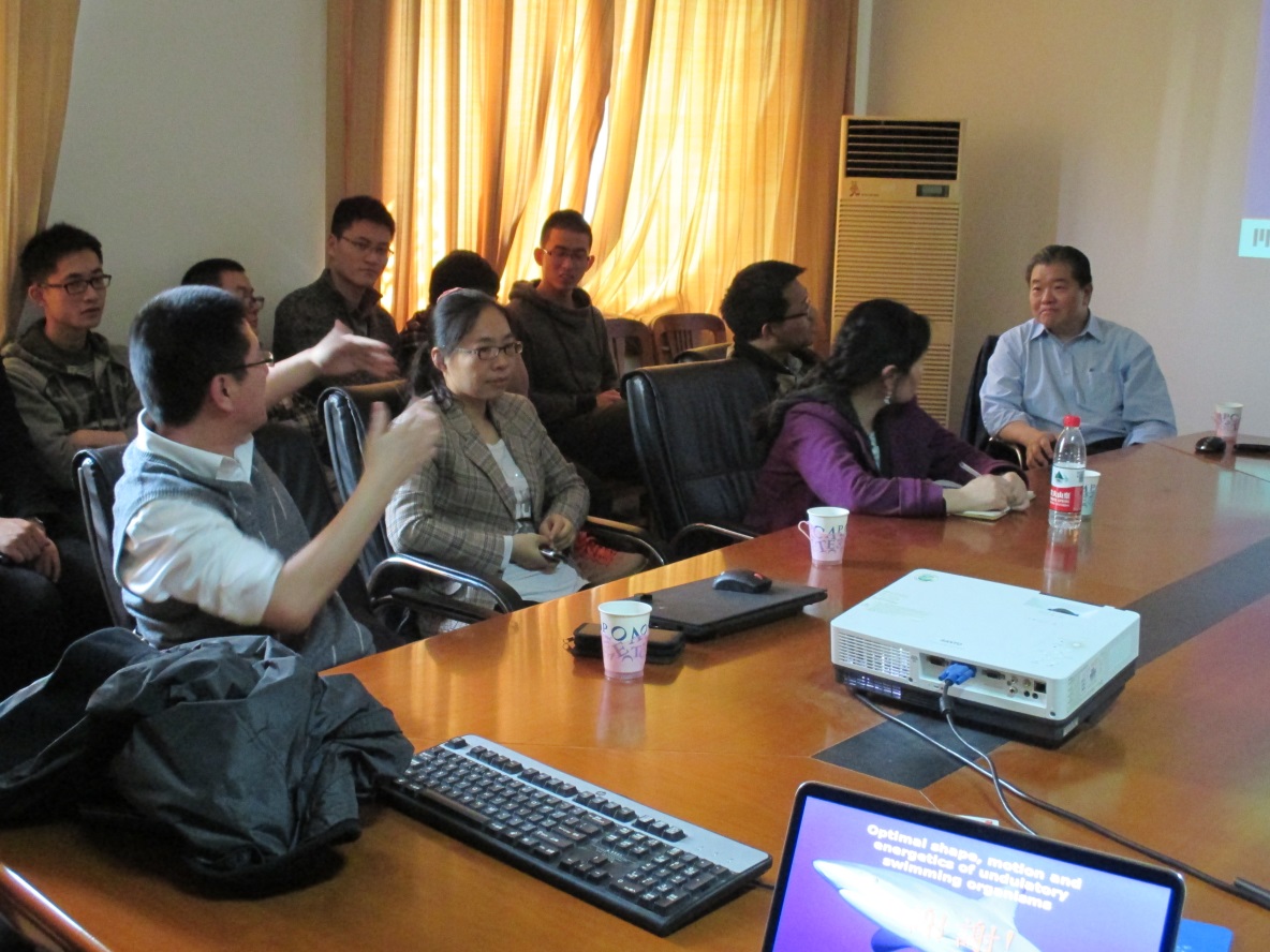 訪問期間,俞教授為航空航天學院師生作了題為“Optimal shape, motion and energetics of undulatory swimming organisms”報告。報告中,俞教授主要介紹了他的團隊在仿魚研究方面的最新研究成果。俞教授及其團隊首先提出了生物肌肉力模型,并用于計算魚體在游動過程中能量的消耗。在此基礎之上,他們根據游動速度以及能量消耗等對任意形狀的游動物體進行形狀優化,最終得到了與自然界中魚類相近的形狀。俞教授幽默風趣、充滿激情的報告激發了老師和同學們對仿生流體力學研究的極大興趣。大家就相關問題展開了熱烈的討論,俞教授針對老師和同學們提出的問題做了詳盡的回答。報告后,俞教授與流體所老師就科研合作和學生培養等方面進行了交流討論。