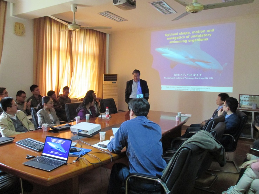 訪問期間,俞教授為航空航天學院師生作了題為“Optimal shape, motion and energetics of undulatory swimming organisms”報告。報告中,俞教授主要介紹了他的團隊在仿魚研究方面的最新研究成果。俞教授及其團隊首先提出了生物肌肉力模型,并用于計算魚體在游動過程中能量的消耗。在此基礎之上,他們根據游動速度以及能量消耗等對任意形狀的游動物體進行形狀優化,最終得到了與自然界中魚類相近的形狀。俞教授幽默風趣、充滿激情的報告激發了老師和同學們對仿生流體力學研究的極大興趣。大家就相關問題展開了熱烈的討論,俞教授針對老師和同學們提出的問題做了詳盡的回答。報告后,俞教授與流體所老師就科研合作和學生培養等方面進行了交流討論。