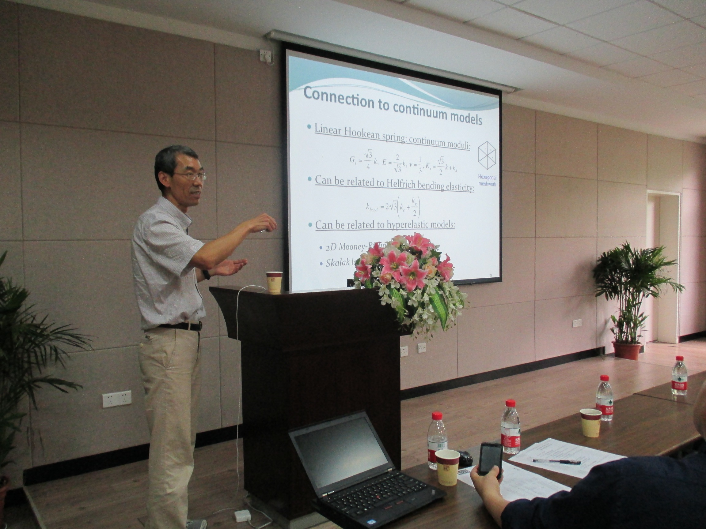 在上午的研討會上,美國賓夕法尼亞大學(xué)Howard H. Hu教授首先介紹了采用極化方法得到的細胞等彈性顆粒在剪切流和單軸拉伸流動中的常微分控制方程組,并探討了其基本運動特性以及在秀麗隱桿線蟲運動模擬方面的應(yīng)用;加拿大英屬哥倫比亞大學(xué)James J. Feng教授采用理論和模擬方法,對比了瘧疾感染和正常紅細胞在光鑷實驗中的拉伸變形行為;臺灣國立交通大學(xué)陳慶耀教授介紹了磁性剛體和磁流體顆粒串懸浮液在交變磁場中的運動和控制,其結(jié)果可用于改進微攪拌器的混合效率;浙江大學(xué)余釗圣教授采用虛擬區(qū)域方法研究了細胞等彈性顆粒在確定性側(cè)向遷移裝置中的運動和分離問題,系統(tǒng)討論了變形率、障礙物尺寸和幾何布置對于顆粒臨界分離半徑的影響。