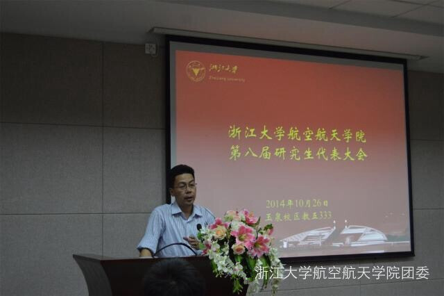 在激昂的國歌聲中大會拉開了序幕。李宇斌同學首先介紹了大會的籌備情況。浙江大學研究生會主席代?F代表浙江大學研究生會致辭,他希望學院研博會進一步加強與學校研究生會、博士生會以及全體研究生的溝通,更加深入地了解學生的需求,更好地成為連接校院、導師和同學們之間的紐帶;他同時還預祝航空航天學院第八次研究生代表大會成功舉行。