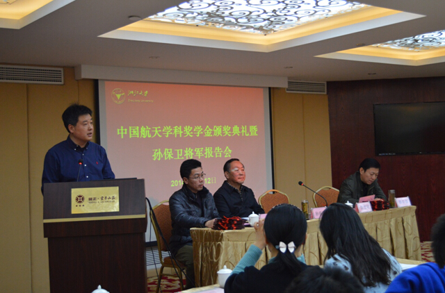 12月12日下午14:30,第五屆中國航天學科獎學金頒獎典禮暨孫保衛將軍報告會在靈峰山莊隆重舉行。原西昌衛星發射中心黨委書記、現任中國航天基金會高級文化顧問孫保衛將軍,中國航天基金會資金管理部部長魏華春,以及我院主持工作副院長邵雪明、院黨委副書記戴志潛和獲獎學生及師生代表50余人出席了頒獎典禮。頒獎典禮由我院黨委副書記戴志潛主持。