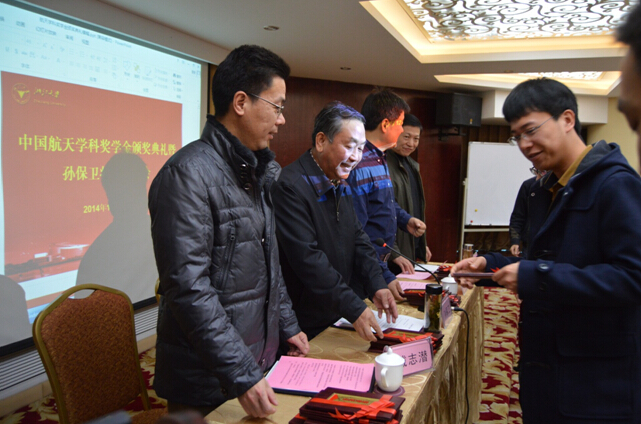 副院長邵雪明教授宣讀了我院2013-2014學年航天學科獎學金獲獎的學生名單,對他們的獲獎表示祝賀并邀請他們上臺領獎。孫保衛將軍、魏華春部長、邵雪明副院長以及戴志潛副書記為獲獎學生頒發榮譽證書并合影留念。