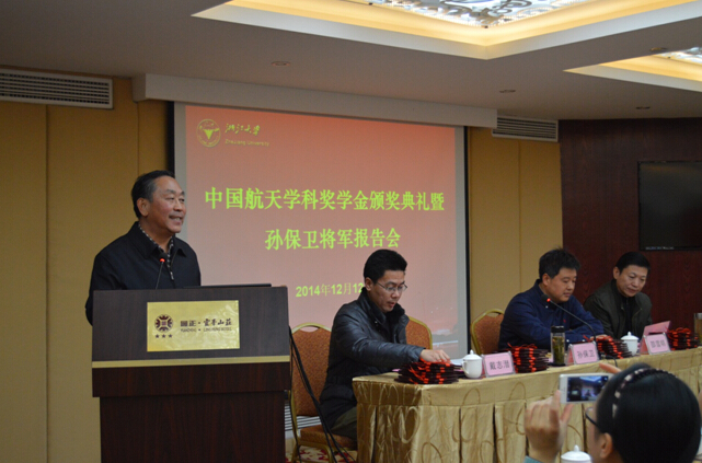 12月12日下午14:30,第五屆中國航天學科獎學金頒獎典禮暨孫保衛將軍報告會在靈峰山莊隆重舉行。原西昌衛星發射中心黨委書記、現任中國航天基金會高級文化顧問孫保衛將軍,中國航天基金會資金管理部部長魏華春,以及我院主持工作副院長邵雪明、院黨委副書記戴志潛和獲獎學生及師生代表50余人出席了頒獎典禮。頒獎典禮由我院黨委副書記戴志潛主持。