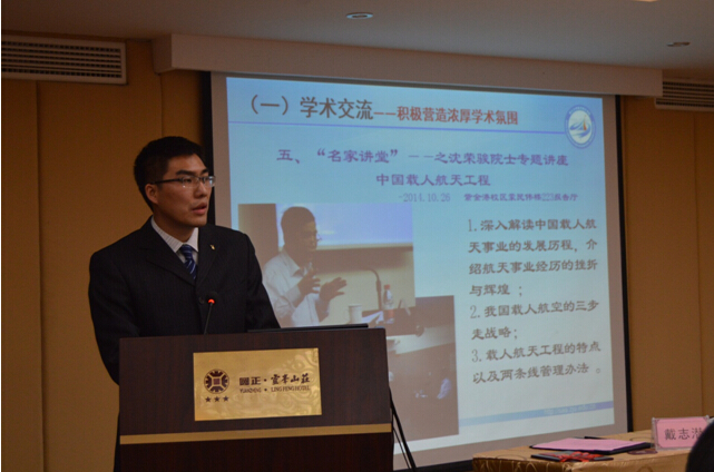 孫保衛將軍的精彩報告為學院第六屆空天學術文化節劃上了圓滿的句點。最后由學院第八屆研博會主席李起陽同學匯報了航空航天學院第六屆空天學術文化節的主要活動,他從學術交流、比賽競技、綜合素質等三個部分展示了航空航天精神與理念的濃厚氛圍以及師生們在活動中的風采 。