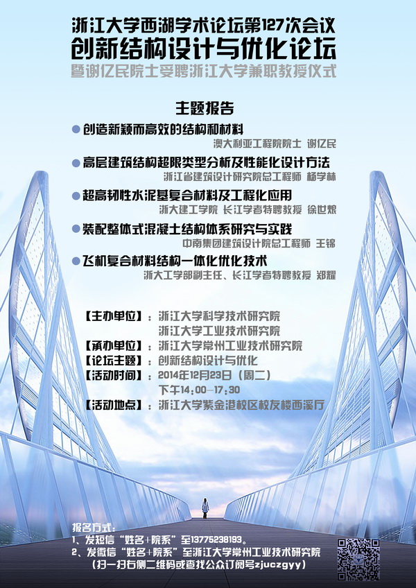 “浙江大學西湖學術論壇第127次會議--創新結構設計與優化”定于2014年12月23日下午在紫金港校區舉辦。論壇將邀請國內外知名大學和建筑設計單位的專家參會研討,促進浙江大學在結構工程領域的創新、研發及合作。論壇主題報告開始前舉行澳大利亞工程院謝億民院士受聘浙江大學兼職教授儀式。