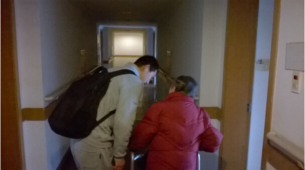 在與這里的醫護人員的交談中我們得知,這里的老人多數是患有老年癡呆癥。因此才被家人送來這里,請這里的醫護人員幫忙看護。在我們與老人交談的過程中,老人們興奮期盼的表情讓我們覺得好像看到了一個個單純的孩子,然而聊天的內容卻是一遍遍的重復前幾秒才說過的內容,然而我們都緊緊地握住老人的雙手,靜靜地聽著,認真的陪著說,誰也不忍心去打攪老人自己的世界。在離開之前,我們把帶來的營養品和水果一一發放到每個老人的手中,還在屋內擺滿了鮮花。