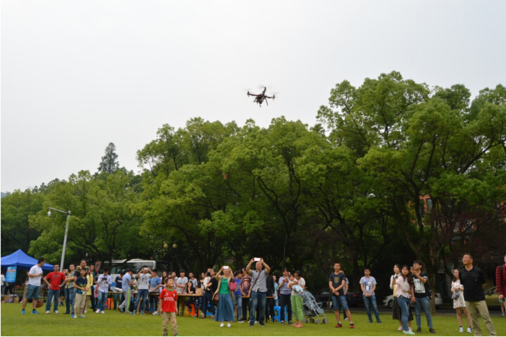 航模表演階段又分為航模展示和航模表演。現場展示的航模有固定翼飛機、直升機以及四旋翼。在航模表演環節,航模隊翟志鵬同學先給我們試飛了一架四旋翼飛機,接著由航模隊隊長胡曉畑為我們帶來固定翼戰斗機表演。表演進行均非常成功,現場氣氛立刻熱烈起來,吸引了校內外很多感興趣的人。