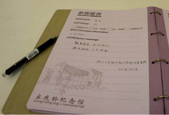 參觀宋慶齡紀(jì)念館后留言:“鞠躬盡瘁,死而后已!揚(yáng)我國(guó)威,立志興邦!——浙江大學(xué)航空航天學(xué)院社會(huì)實(shí)踐團(tuán)”