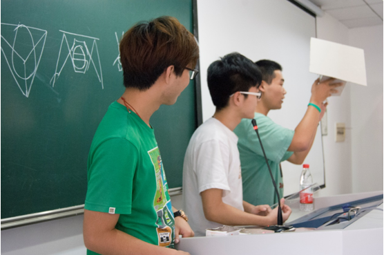 活動采用三人一組制作作品的方式進(jìn)行比賽,活動報名和材料發(fā)放在一周前就進(jìn)行完畢,“讓鉛筆飛”和“小小返回艙”兩個比賽項目分別有6組和8組同學(xué)報名參加。25號下午一點(diǎn),參加比賽的各個小組在西區(qū)教室集中完畢,待準(zhǔn)備就緒,兩個項目共十四組同學(xué)分別將自己組這一周的努力成果展現(xiàn)在大家面前:滑翔性能良好的大展弦比機(jī)翼,想法大膽新奇的超長光滑滑跑平臺,雞蛋下方各式緩沖裝置……臺上繪聲繪色的講解和展示,臺下聚精會神的聆聽和記錄,帶動了科技節(jié)競賽的白熱化氛圍,正式拉開了本次科技節(jié)的序幕。