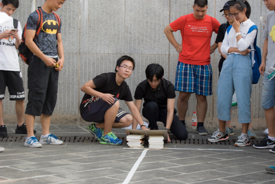 緊接著,視線投向了下沉廣場(chǎng)上方平臺(tái),剩余的八組“小小返回艙”比賽選手將在5米的高度釋放自己的雞蛋及其保護(hù)裝置。這要求在雞蛋無(wú)破碎的同時(shí)盡可能的靠緊目標(biāo)基準(zhǔn)點(diǎn),在考驗(yàn)同學(xué)們緩沖設(shè)備科學(xué)性的同時(shí),更需要我們對(duì)風(fēng)向和風(fēng)速的精準(zhǔn)判斷和靈活應(yīng)變能力。