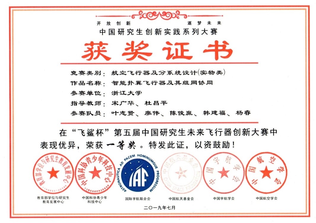 我院葉志賢、廖偉、陳俊胤、韓建福和楊睿同學完成的作品“智能撲翼飛行器及其組網協同”在“飛鯊杯”第五屆中國研究生未來飛行器創新大賽中榮獲一等獎,該作品由我院宋廣華和杜昌平老師指導,也得到了中國研究生未來飛行器創新大賽系列賽事專家委員會委員鄭耀教授的悉心指導。同時,浙江大學獲授“優秀組織獎”。