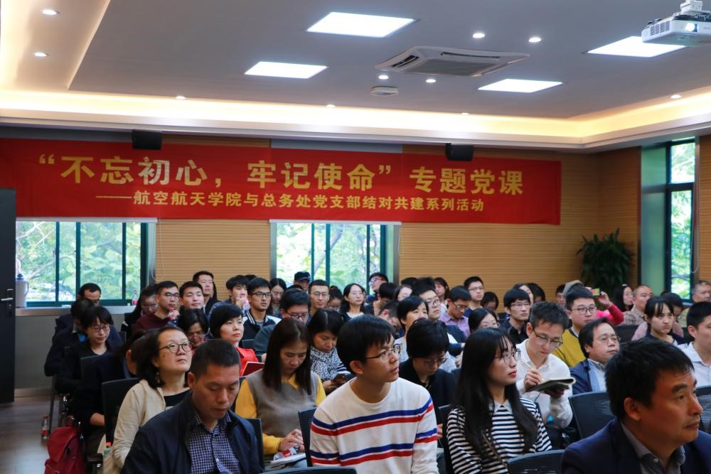 為學(xué)習(xí)貫徹習(xí)近平總書記在“不忘初心、牢記使命”主題教育工作會(huì)議的重要講話精神,深刻領(lǐng)會(huì)總書記關(guān)于黨的初心和使命的重要論述,10月18日下午,“不忘初心,牢記使命”專題黨課活動(dòng)在教五333會(huì)議室舉行。此次活動(dòng)是航空航天學(xué)院與總務(wù)處黨支部結(jié)對(duì)共建系列活動(dòng)的重要內(nèi)容。活動(dòng)邀請(qǐng)總務(wù)處處長吳紅瑛、總務(wù)處黨支部書記朱宇恒、航空航天學(xué)院黨委書記畢建權(quán)、航空航天學(xué)院黨委副書記戴志潛和流體所研究生黨支部書記劉炳瑞上臺(tái)為黨員同志講黨課。本次專題黨課由戴志潛主持,三個(gè)黨支部全體黨員、預(yù)備黨員和積極分子80余人參加了本次活動(dòng)。