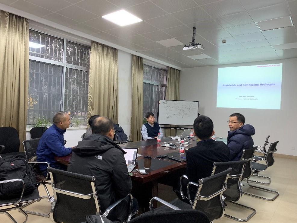訪問期間,Joen教授作了題目為“Stretchable and Self-Healing Hydrogels”(可拉伸與自愈合水凝膠)的學術報告。水凝膠目前已是多學科的一個研究領域,無數基于奇思妙想的交叉研究使得水凝膠的功能越來越豐富,越來越非常規。Joen教授課題組通過引入親疏水基團,構造了一種新的交聯方式,從而使水凝膠的拉伸率可以高達100倍而不破壞,同時又有很好的自愈合功能。Joen教授還介紹了一種水凝膠碗的設計,可以利用該碗表面的親疏水特性完成海面原油的自采集。他的報告引起了參加者的廣泛興趣,他也表達了與浙大應力所相關老師合作的愿望。