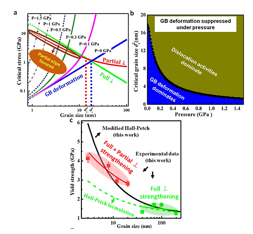 圖2. 激發晶界形變的臨界應力、臨界晶粒尺寸與壓力之間的定量關系,以及基于修正Hall-Petch關系的屈服強度尺寸效應的預測。