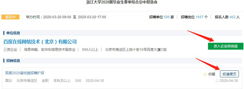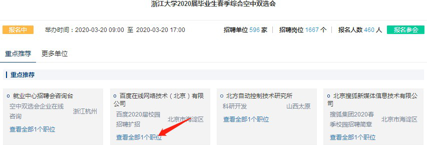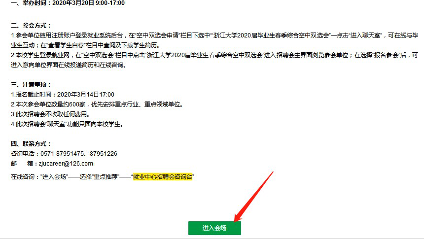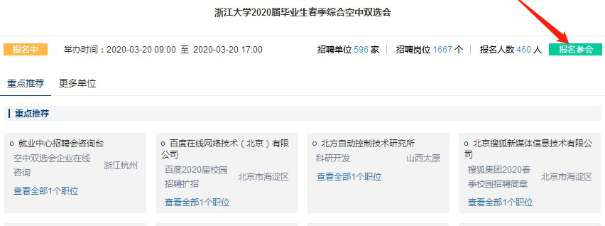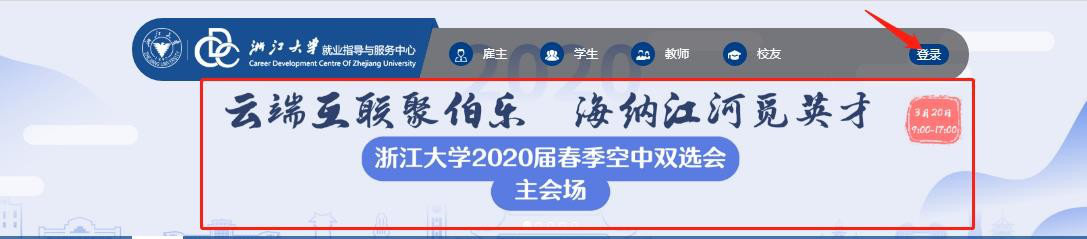 方法 1:點擊首頁上方“浙江大學 2020 屆畢業生春季綜合空中雙選會”圖片進入招聘會主界面。