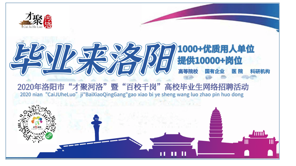 2020年洛陽市“才聚河洛”暨“百校千崗”高校畢業生網絡招聘活動由中共洛陽市委人才工作領導小組辦公室、洛陽市人力資源和社會保障局、共青團洛陽市委主辦,洛陽市人力資源和公共就業服務中心承辦,洛陽人才網為主官網(www.Lyhero.com)。屆時,洛陽市各大用人單位(包括高校、醫療機構、科研院所、博士后流動站、工作站)、大型企業等1000家以上用人單位參加,提供10000個崗位,面向博士、碩士、本科、大中專、職專等畢業生引才,歡迎廣大高校學子來洛陽就業創業。
