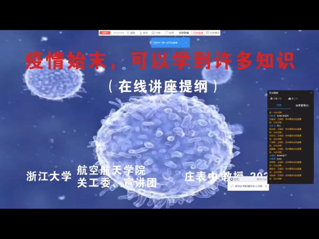 2020年4月10日,航空航天學(xué)院通過(guò)浙大釘直播平臺(tái)開(kāi)展線上黨課。86歲高齡的浙江大學(xué)關(guān)工委宣講團(tuán)成員、航空航天學(xué)院退休教師莊表中教授主講,黨員、預(yù)備黨員及入黨積極分子共計(jì)260余人集聚云端,共同聆聽(tīng)“疫情始末,可以學(xué)到許多知識(shí)”主題黨課,共話新時(shí)代黨員使命擔(dān)當(dāng)。