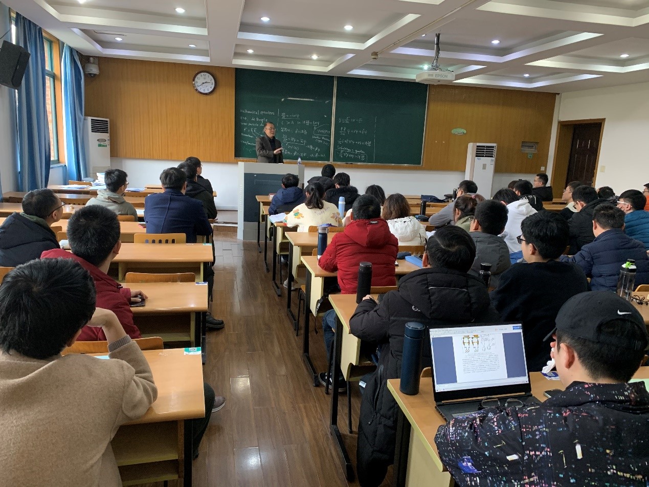 12月24日下午,趙亞溥教授空手上了講臺,拿起粉筆和黑板擦就開始了連續近3小時的授課。他主要圍繞近代物理對經典力學框架的補充和更高視角下的經典力學兩個方面展開:從波函數入手,通過引入算符的概念,由能量守恒導出了薛定諤方程;從狹義相對論的洛倫茲變換講到群與諾特定理,討論了質量守恒與質量-能量對稱的關系,再抽象到流形與度量;最后介紹了麥克斯韋方程組與經典場論的內容。趙教授風趣幽默,寓教于樂,在概念講解和公式推導期間不時地穿插古今力學家的逸聞軼事,引得臺下師生會心一笑。這堂課在輕松融洽的氛圍中畫上了圓滿的句號。