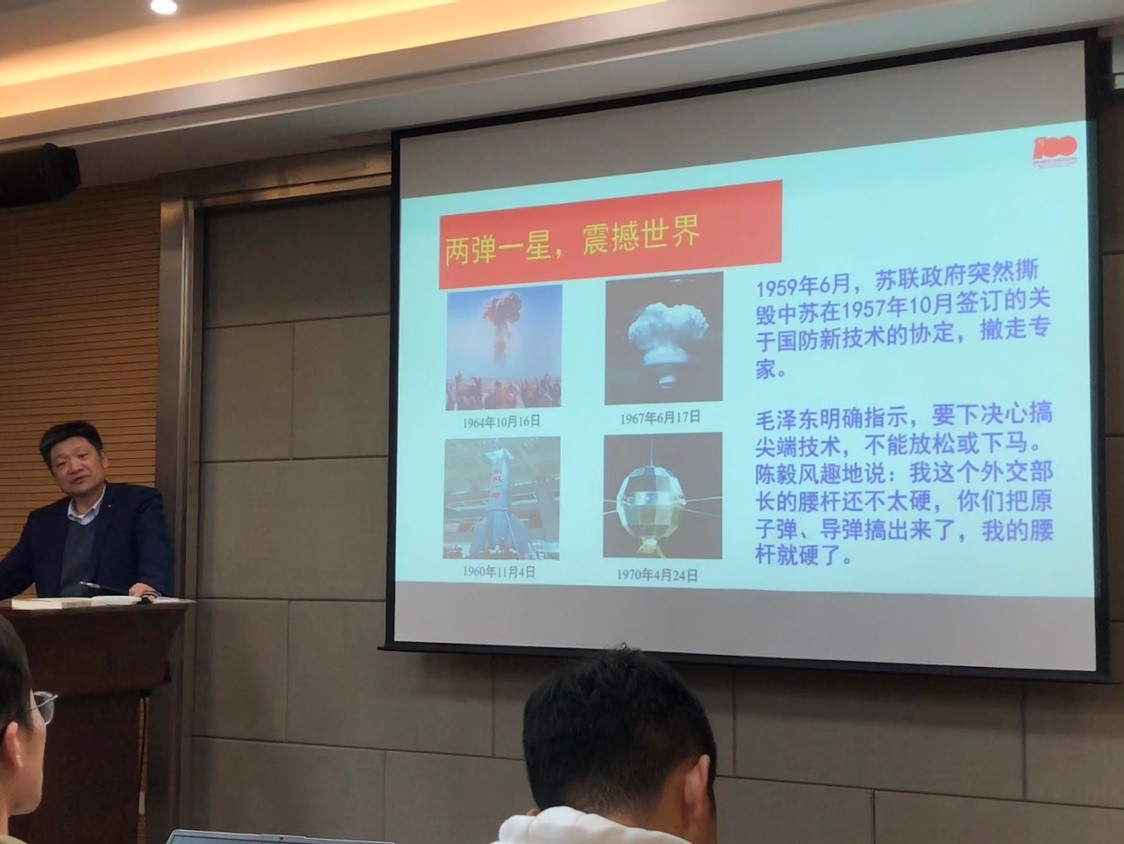 陳偉球老師首先闡述了選題背景,一方面是先輩們偉大的精神值得大家學習,另一方面“兩彈一星”與航院專業密切相關。隨后,他基于當時國內的情況與國際的形勢,指出研制原子彈、氫彈、人造衛星的必要性。從黨的領導、海外華僑科學家回國、蘇聯初期的幫助等方面道出了原子彈研制的可行性,并依據當時元勛們遞交的材料和意見,論證了人造衛星的可做性。同時,延伸拓展,講述了“兩彈一星”的偉大性以及對其他行業的影響。他總結,這一系列的成果是社會主義集中力量辦大事的體現,以當時的工業狀況,科技水平,放在任何一個其他國家都不可能完成這樣的壯舉,這也體現了社會主義的優越性。他還提到了胡海昌、王淦昌、錢三強、程開甲、屠守鍔等優秀校友,并詳細講述了兩彈一星元勛錢學森、郭永懷、楊嘉墀的事跡和成就,強調了兩彈一星精神,即熱愛祖國,無私奉獻;自力更生,艱苦奮斗;大力協同,勇于攀登。最后,他寄語全體支部黨員,要要樹立遠大目標,將自己的研究貢獻同國家戰略需求結合起來,做到知行合一。
