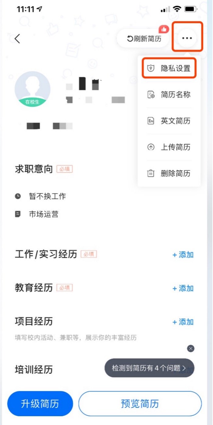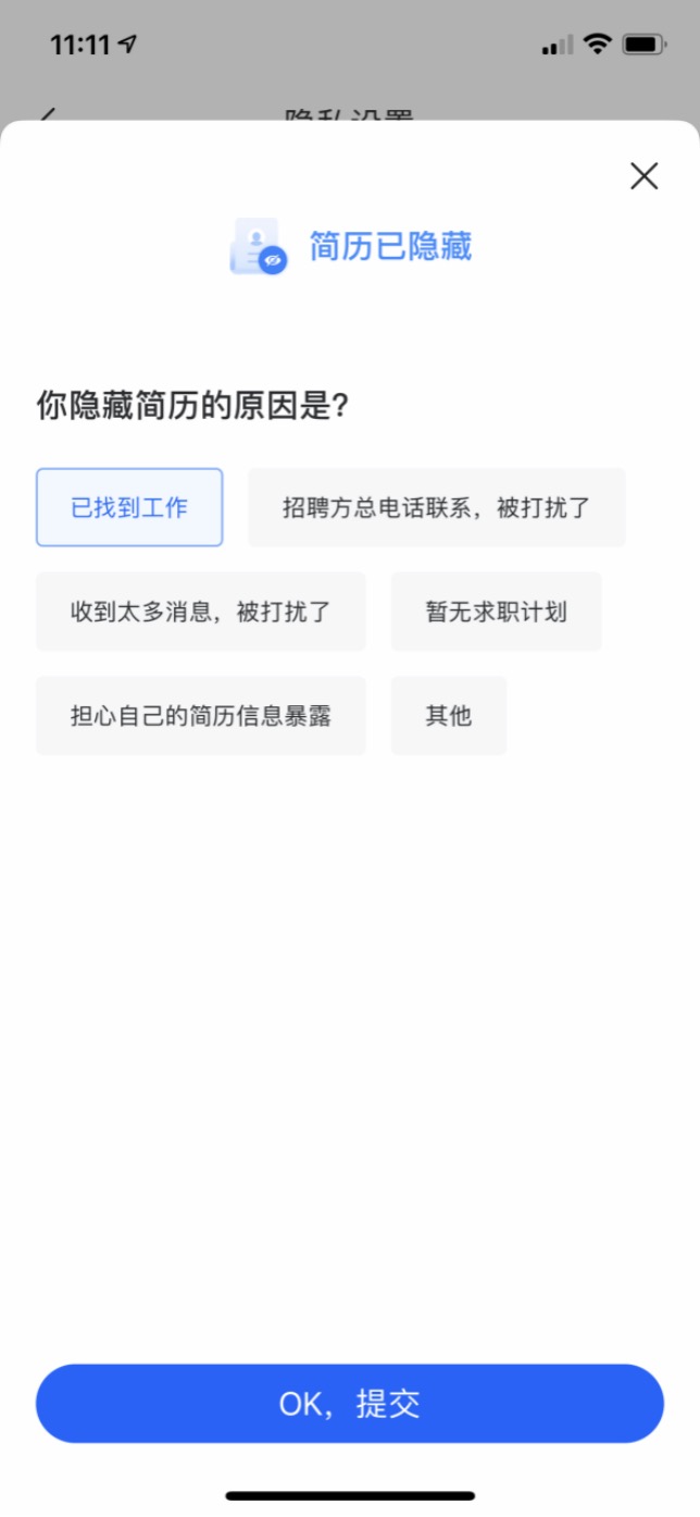備注:如不希望簡歷被企業方搜索查看,可通過以下步驟選擇原因隱藏簡歷。隱藏后的簡歷僅主動投遞時可被查看。