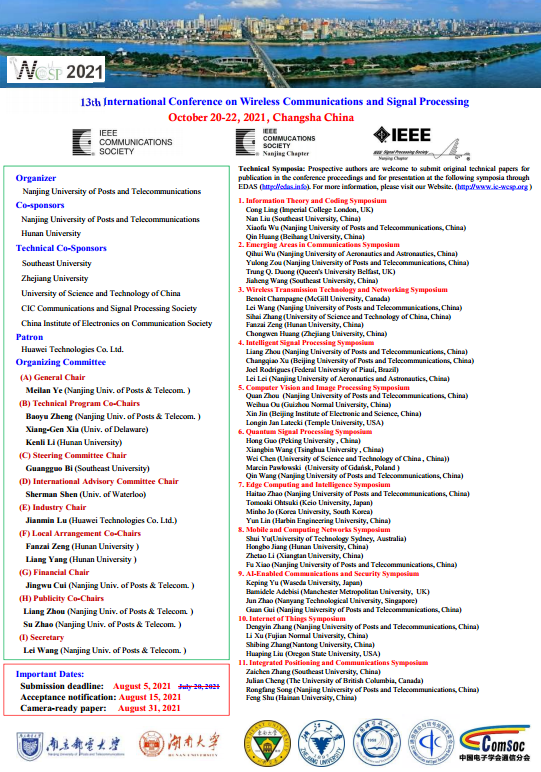 13屆無線通信與信號處理國際學術會議(WCSP2021)將于今年102022日在湖南長沙召開。這是教育部和IEEE批準的、由IEEE Communication SocietyIEEE Communication Society Nanjing ChapterIEEESignal Processing Society Nanjing Chapter、東南大學、浙江大學等協辦的國際學術會議,是展示成果、校企交流、認識同行的平臺。會議將邀請國內外知名學者作keynote報告。與往屆一樣,本屆會議錄用并參會報告的論文將全部進 IEEEXplore 數字圖書館,并提交EI Compendex