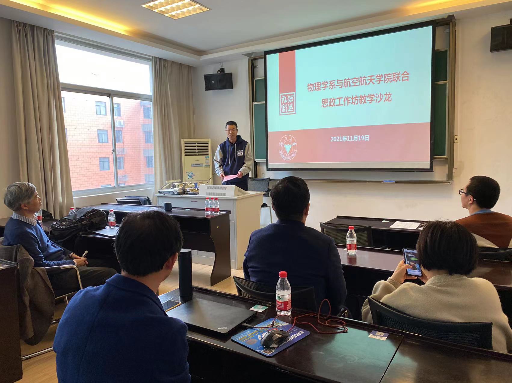 2021年11月19日下午,航空航天學(xué)院與物理學(xué)系課程思政工作坊教學(xué)沙龍?jiān)谟袢^(qū)第十二教學(xué)樓423教室舉辦。沙龍邀請(qǐng)了教育部物理教指委委員、國(guó)家教學(xué)成果獎(jiǎng)二等獎(jiǎng)獲得者、教學(xué)名師盛正卯教授、航空航天學(xué)院吳昌聚副教授、物理實(shí)驗(yàn)教學(xué)中心陳水橋高級(jí)工程師三位教師作為主講人,物理學(xué)系副系主任趙道木教授及航空航天學(xué)院副院長(zhǎng)王高峰教授等20余位來自物理學(xué)系和航空航天學(xué)院的教師參加了此次活動(dòng)。