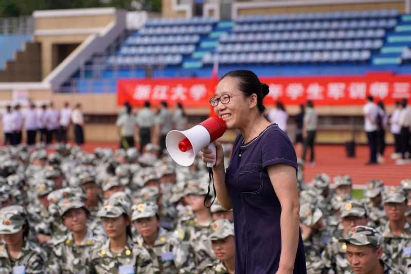 黨委書記劉玉玲在熱烈的掌聲中進入草坪觀眾席。她首先肯定了所有同學在軍訓期間付出的大量努力和取得的優秀成果,鼓勵同學們培養吃苦耐勞、樂觀向上的紅色精神。隨后她還向同學們介紹了浙江大學創新2030計劃項目——空天探索會聚研究計劃(問天計劃),指出航空航天專業的良好發展前景和探索浩瀚宇宙的戰略意義。