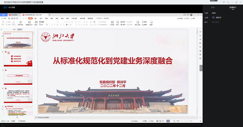為深入學習貫徹黨的二十大精神,充分發揮學院黨建骨干的示范、引領和服務作用,進一步加強基層黨建工作,提高基層黨建骨干隊伍的政治理論水平、業務能力和創新精神,切實發揮基層黨組織的戰斗堡壘作用和黨員的先鋒模范作用,讓黨建骨干成為基層黨建的中堅力量,12月9日下午,航空航天學院采用釘釘線上直播的方式舉行2022年度黨建骨干培訓會。航空航天學院學生黨建工作指導委員會委員、領航黨員素質發展中心成員、全體師生黨支部委員和材料科學與工程學院全體師生黨支部委員參會,會議由航空航天學院專職組織員蔡庚午主持。
