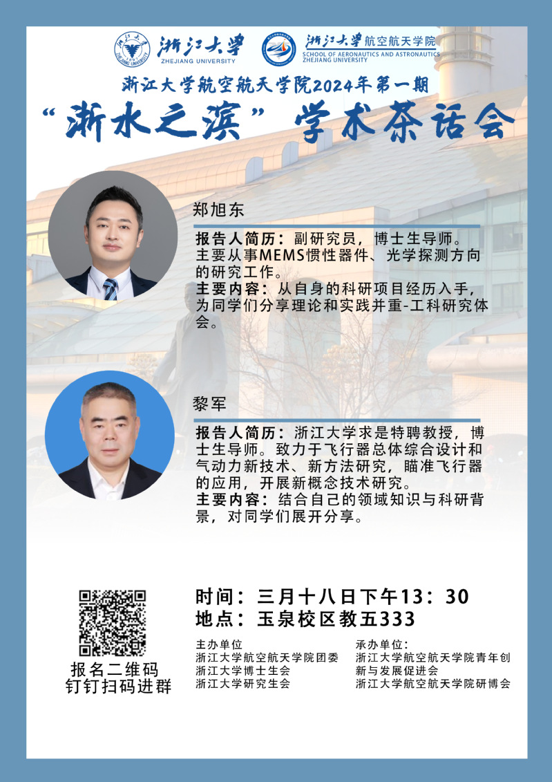 為了幫助航院學子以良好的狀態(tài)展開科研工作,引導他們跨過研究生階段的迷茫溝壑,為其提供必要的學習信息和發(fā)展經驗,航空航天學院研博會特舉辦2024年第一期“浙水之濱”學術茶話會,具體通知如下: