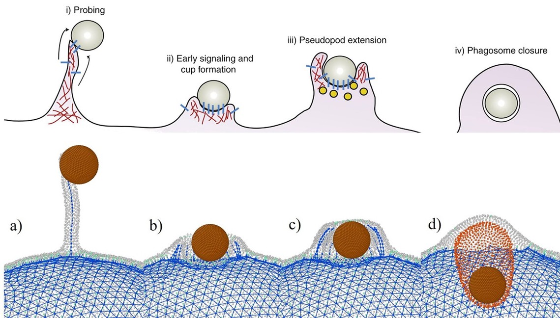 巨噬細胞是是一種廣泛分布于全身的免疫細胞,在先天性免疫和獲得性免疫反應(yīng)中都起著重要作用。其中,吞噬作用是指巨噬細胞識別并吞噬病原體或其他異物(包括腫瘤細胞以及自身衰老和異常的紅細胞等)的過程,涉及細胞形態(tài)改變、骨架重構(gòu)、表面粘附、細胞突出和信號轉(zhuǎn)導等復雜的協(xié)同行為。這一過程引起了生物物理和生物力學領(lǐng)域的廣泛關(guān)注。長期以來,研究人員致力于發(fā)展理論模型來解析在此過程中巨噬細胞如何有效變形并完成吞噬,但現(xiàn)有模型往往無法考慮細胞骨架重構(gòu)和細胞膜-細胞骨架相互作用,導致模型分析與實驗數(shù)據(jù)出現(xiàn)較大差異。為此,從巨噬細胞結(jié)構(gòu)出發(fā)構(gòu)建包含細胞膜和細胞骨架信息的細胞力學模型,可為從分子到細胞等不同層面探究吞噬過程中細胞膜和細胞骨架的動力學行為提供新途徑。