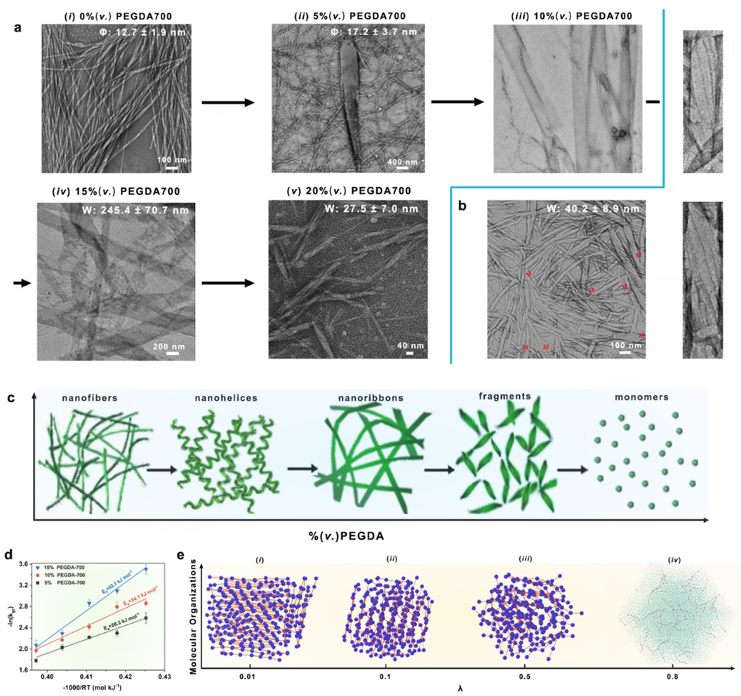 本文以被廣泛研究的自組裝短肽——Fmoc-FF為例,其自組裝納米纖維基水凝膠儲(chǔ)能模量約為40.5 ± 10.9 kPa,遠(yuǎn)不足以擔(dān)任基底材料支撐器件結(jié)構(gòu)。為了提高其機(jī)械性能,本文在短肽自組裝過程中引入乙二醇二甲基丙烯酸酯(PEGDA)作為輔助劑,通過增加短肽—溶劑分子間的相互作用力,精確控制自組裝結(jié)構(gòu)扭曲力與結(jié)合力之間的力學(xué)平衡,首次實(shí)現(xiàn)了Fmoc-FF自組裝納米纖維轉(zhuǎn)變成納米螺旋,并進(jìn)一步展開成納米帶結(jié)構(gòu)。通過實(shí)驗(yàn)表征和分子動(dòng)力學(xué)模擬相結(jié)合,論文詳細(xì)探究了PEGDA對Fmoc-FF自組裝影響的分子機(jī)制和作用規(guī)律(圖2)。