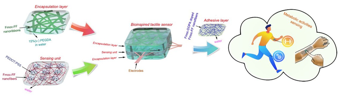 因此,分別利用短肽自組裝納米帶和納米纖維(與導(dǎo)電高分子PEDOT:PSS共組裝)基超分子水凝膠設(shè)計(jì)制造基底和敏感單元部件,可以制備出肽自組裝基觸覺感知器件。性能標(biāo)定測試實(shí)驗(yàn)表明:該短肽自組裝基觸覺傳感器具有適當(dāng)?shù)撵`敏度、快速的動(dòng)態(tài)響應(yīng)、可變振幅/頻率的高分辨率以及可靠的穩(wěn)定性,從而可作為傳統(tǒng)高分子聚合物基觸覺感知器件的替代品用于可穿戴設(shè)備和人機(jī)接口應(yīng)用,如運(yùn)動(dòng)檢測和健康監(jiān)測等。