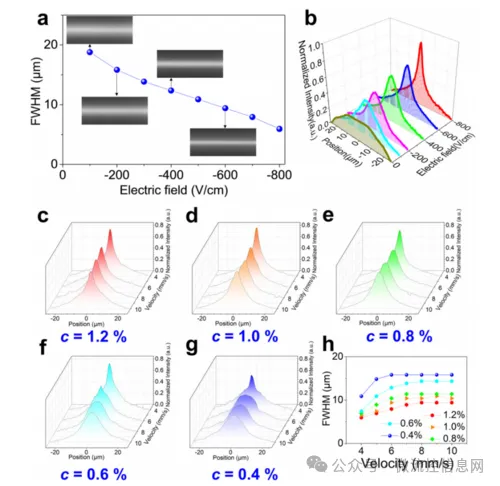 圖4系統(tǒng)研究了電場(chǎng)強(qiáng)度、流速和PEO溶液濃度這三個(gè)關(guān)鍵因素對(duì)納米顆粒聚焦效果的影響。通過(guò)一系列實(shí)驗(yàn)數(shù)據(jù),展示了不同電場(chǎng)強(qiáng)度下納米顆粒聚焦的熒光強(qiáng)度分布和半高寬變化,表明電場(chǎng)強(qiáng)度的增加可顯著改善聚焦效果;同時(shí),分析了不同流速和 PEO 濃度組合下的聚焦性能,發(fā)現(xiàn) PEO 濃度在一定范圍內(nèi)對(duì)聚焦效果有顯著影響,過(guò)高或過(guò)低的濃度均不利于納米顆粒聚焦。該圖通過(guò)量化分析為優(yōu)化納米顆粒操控條件提供了重要參考。