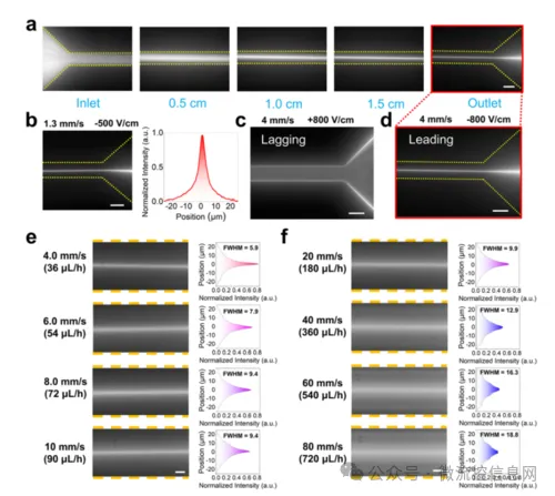 圖2呈現(xiàn)了在優(yōu)化條件下,100 nm 納米顆粒在大尺寸微通道中的高通量聚焦過(guò)程及效果。通過(guò)熒光成像技術(shù)記錄了納米顆粒從均勻分布到逐步向通道中心聚焦的動(dòng)態(tài)過(guò)程,展示了不同位置的熒光圖像,以及在不同流速和電場(chǎng)強(qiáng)度下聚焦效果的量化分析。結(jié)果表明,適當(dāng)調(diào)整電場(chǎng)方向和強(qiáng)度可有效驅(qū)動(dòng)納米顆粒遷移并實(shí)現(xiàn)聚焦,且聚焦效果隨電場(chǎng)強(qiáng)度增加而顯著提升,為納米顆粒的高效操控提供了實(shí)驗(yàn)依據(jù)。
