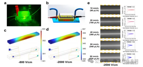 圖5聚焦于高電場(chǎng)下焦耳熱對(duì)納米顆粒聚焦的影響及其控制方法。通過(guò)模擬和實(shí)驗(yàn)展示了不同電場(chǎng)強(qiáng)度下微通道內(nèi)的溫度分布,揭示了焦耳熱引起的溫度升高對(duì)納米顆粒聚焦的潛在負(fù)面影響。進(jìn)一步通過(guò)干冰冷卻系統(tǒng)實(shí)現(xiàn)了對(duì)芯片溫度的有效控制,并在高電場(chǎng)條件下展示了納米顆粒的聚焦效果,證明了溫度控制策略可顯著提升納米顆粒聚焦的效率和穩(wěn)定性,為高通量納米顆粒操控提供了可行的熱管理方案。
