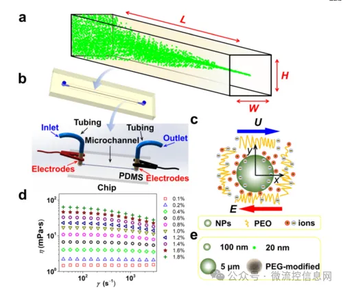 圖1綜合展示了微通道的尺寸設(shè)計(jì)、微流控芯片的整體結(jié)構(gòu)以及納米顆粒在多物理場(chǎng)控制下的操控原理。其中,微通道為直矩形結(jié)構(gòu),尺寸參數(shù)滿足高通量操作需求;芯片集成有電極和流體通道,用于施加電場(chǎng)和輸送納米顆粒懸浮液。此外,圖中還通過(guò)示意圖解釋了納米顆粒在非牛頓流體中受電場(chǎng)和流場(chǎng)耦合作用的遷移機(jī)制,以及不同PEO濃度溶液的流變學(xué)特性,為后續(xù)實(shí)驗(yàn)提供了理論基礎(chǔ)。